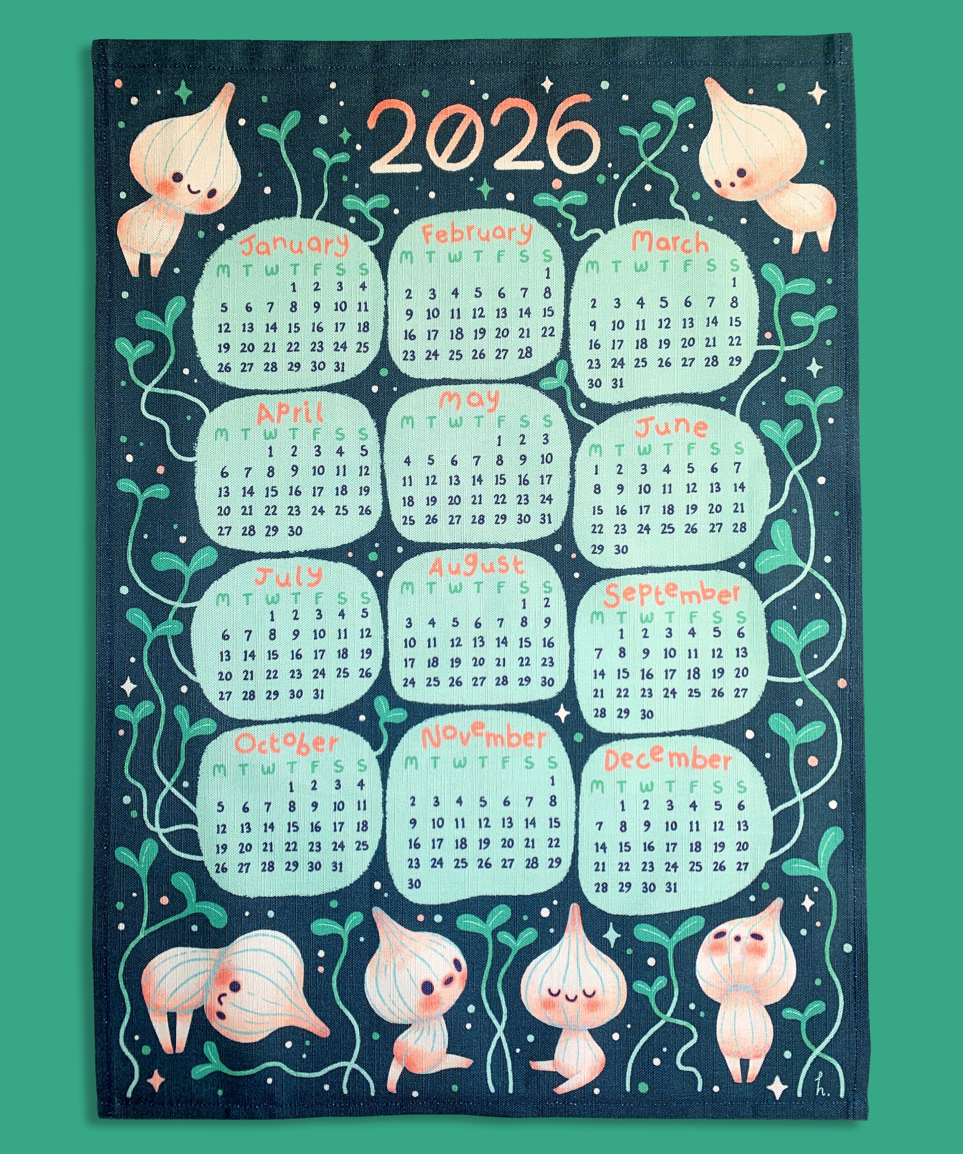 This is the new Hannakin garlic sprout themed 2026 Calendar Tea Towel!