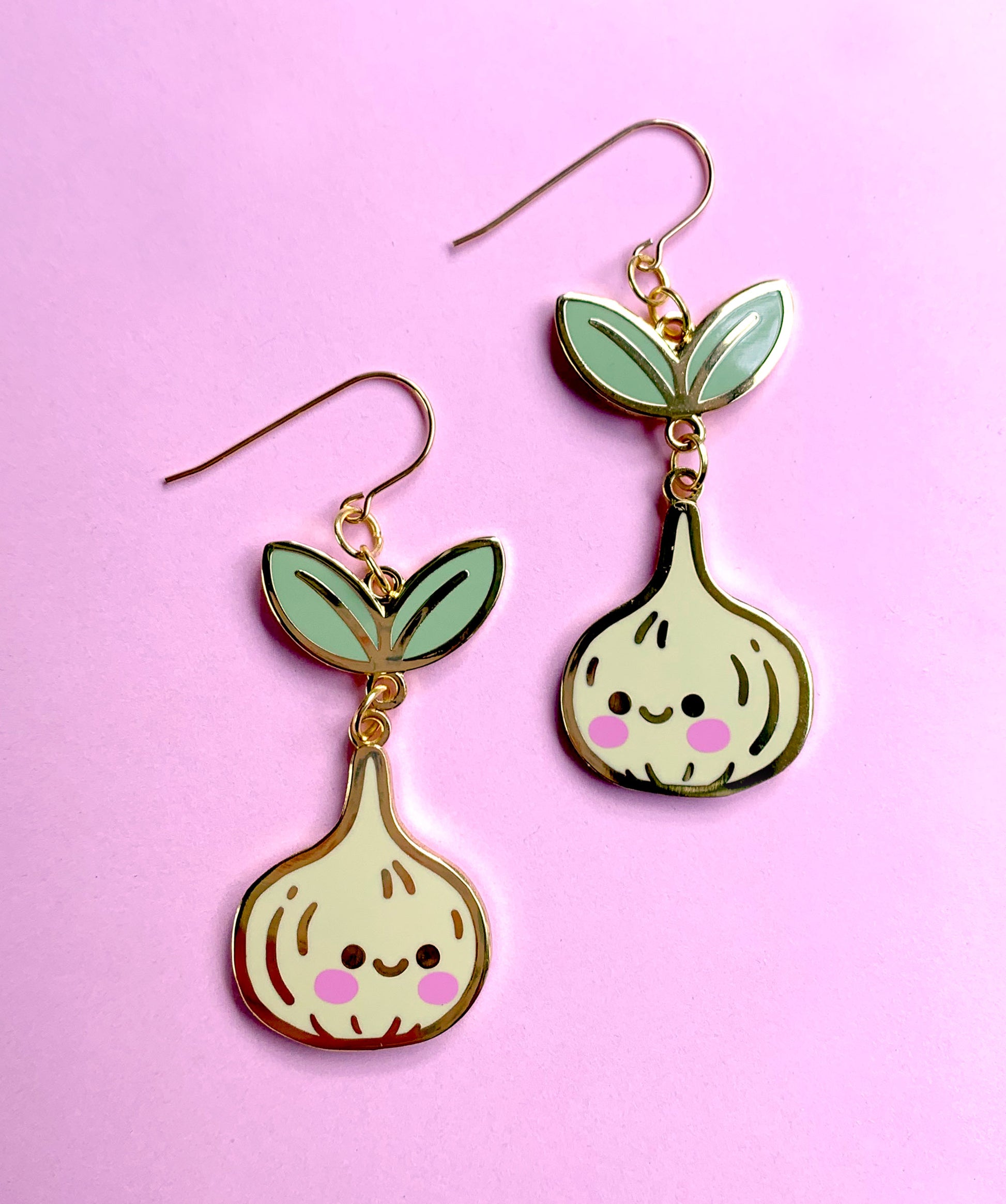 Made from hard enamel with pink, screen-printed rosy cheek details and shiny gold metal finish on high quality Hypo-Allergenic, gold plated, brass based hooks.