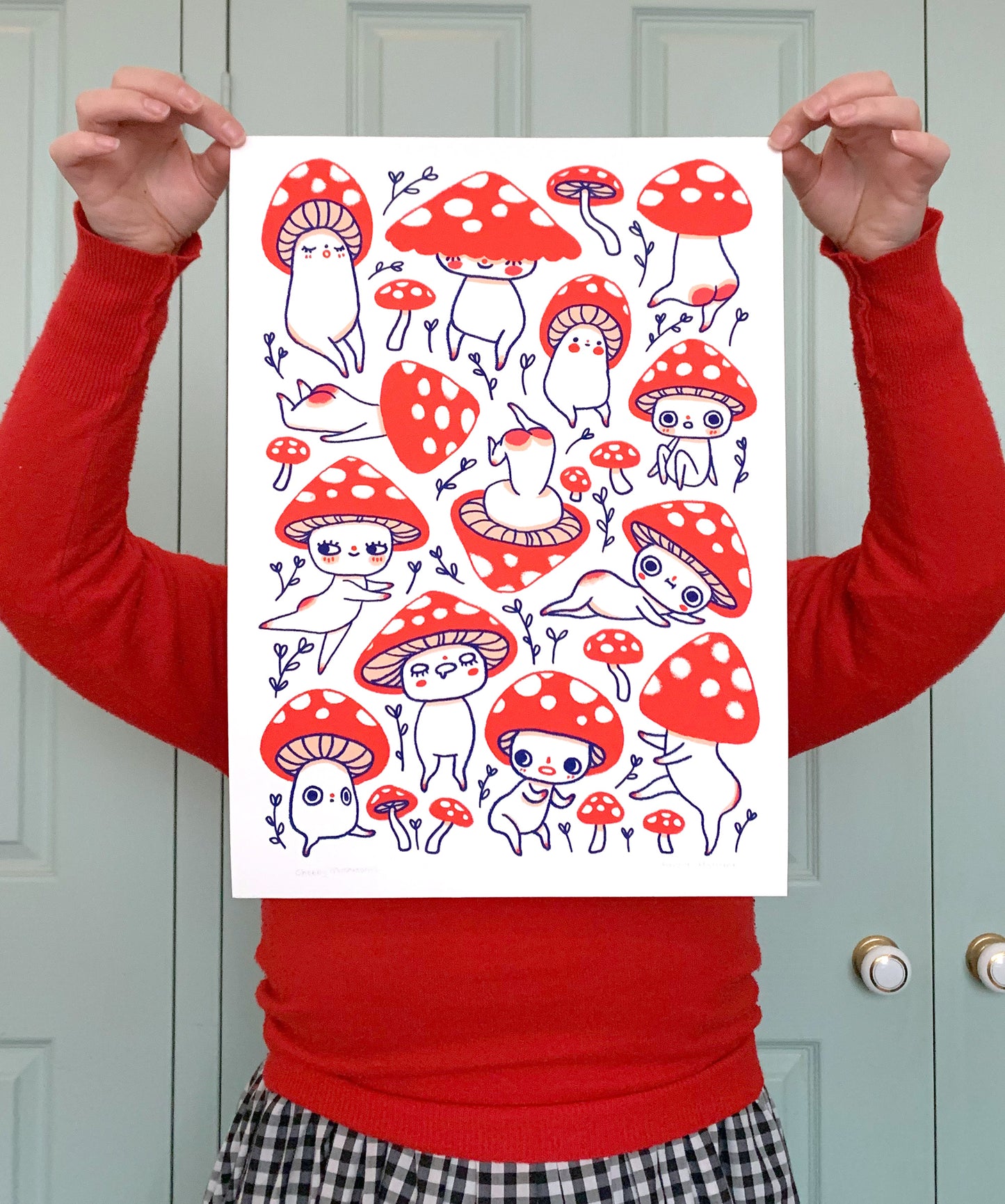 An archival quality print of digital illustration 'Cheeky Mushrooms', on acid free 320 gsm 100% cotton rag paper.