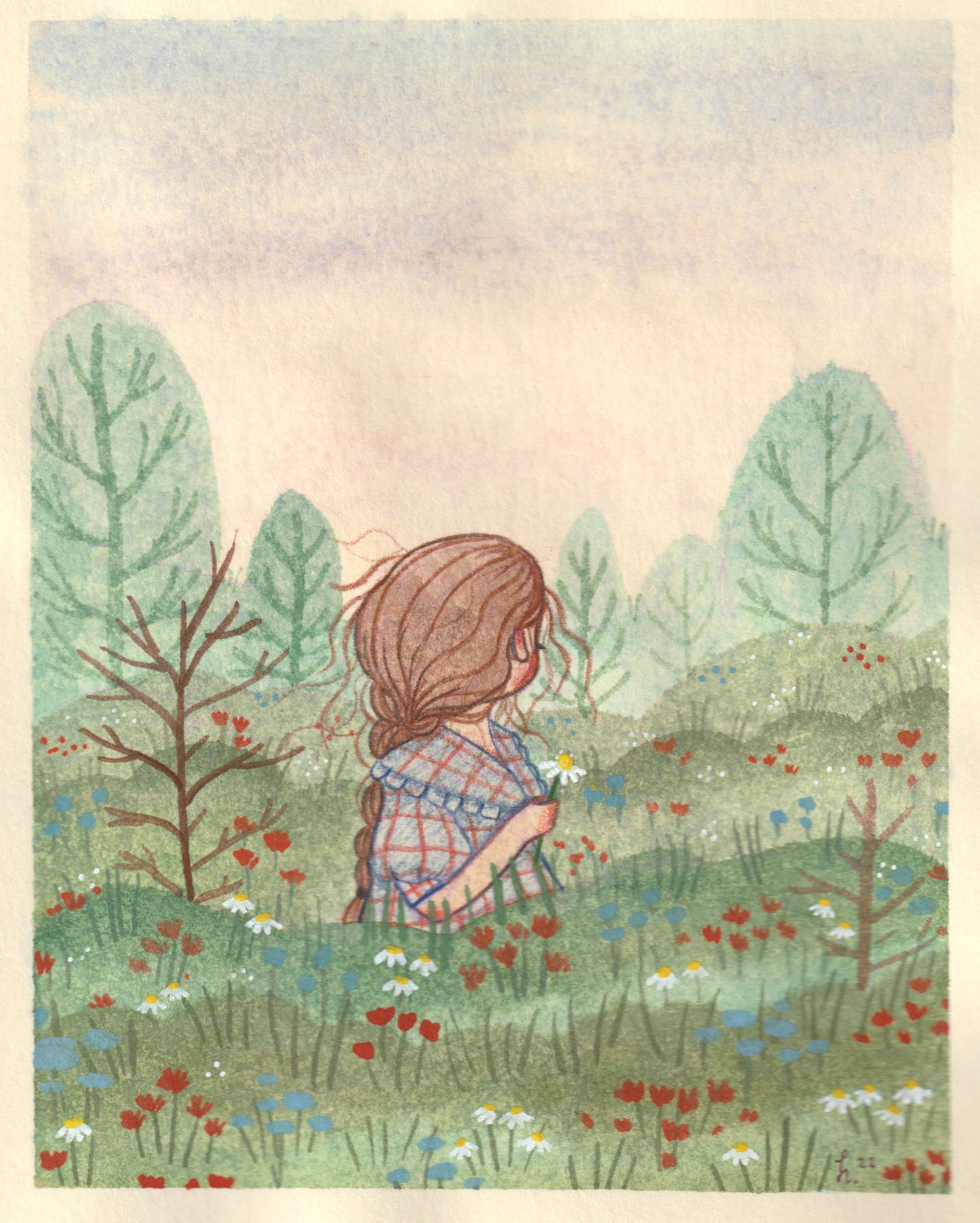 Original watercolour and coloured pencil illustration "Dusk in the Heather", 2022, on smooth cream coloured printmaking paper with rough torn edges.