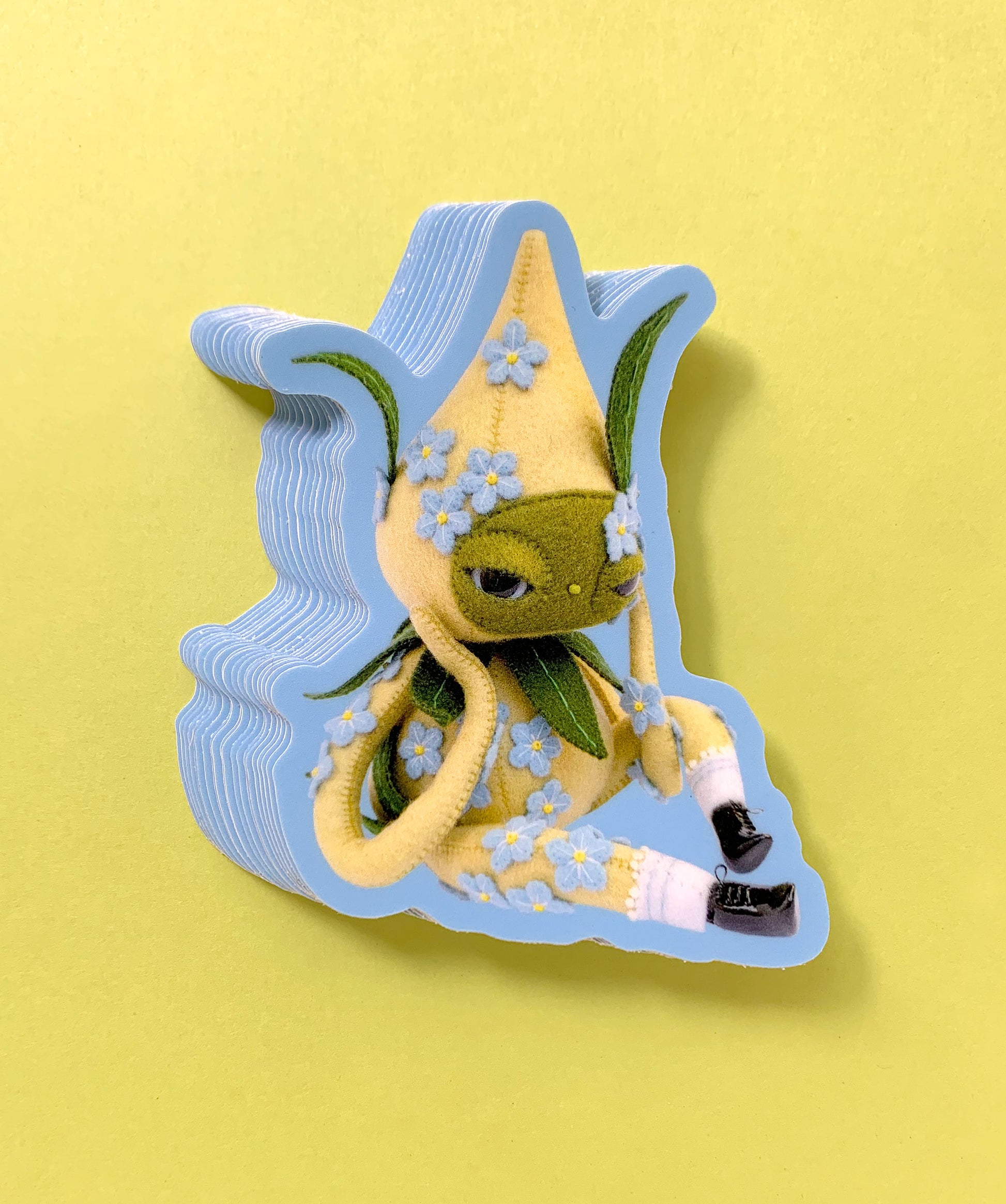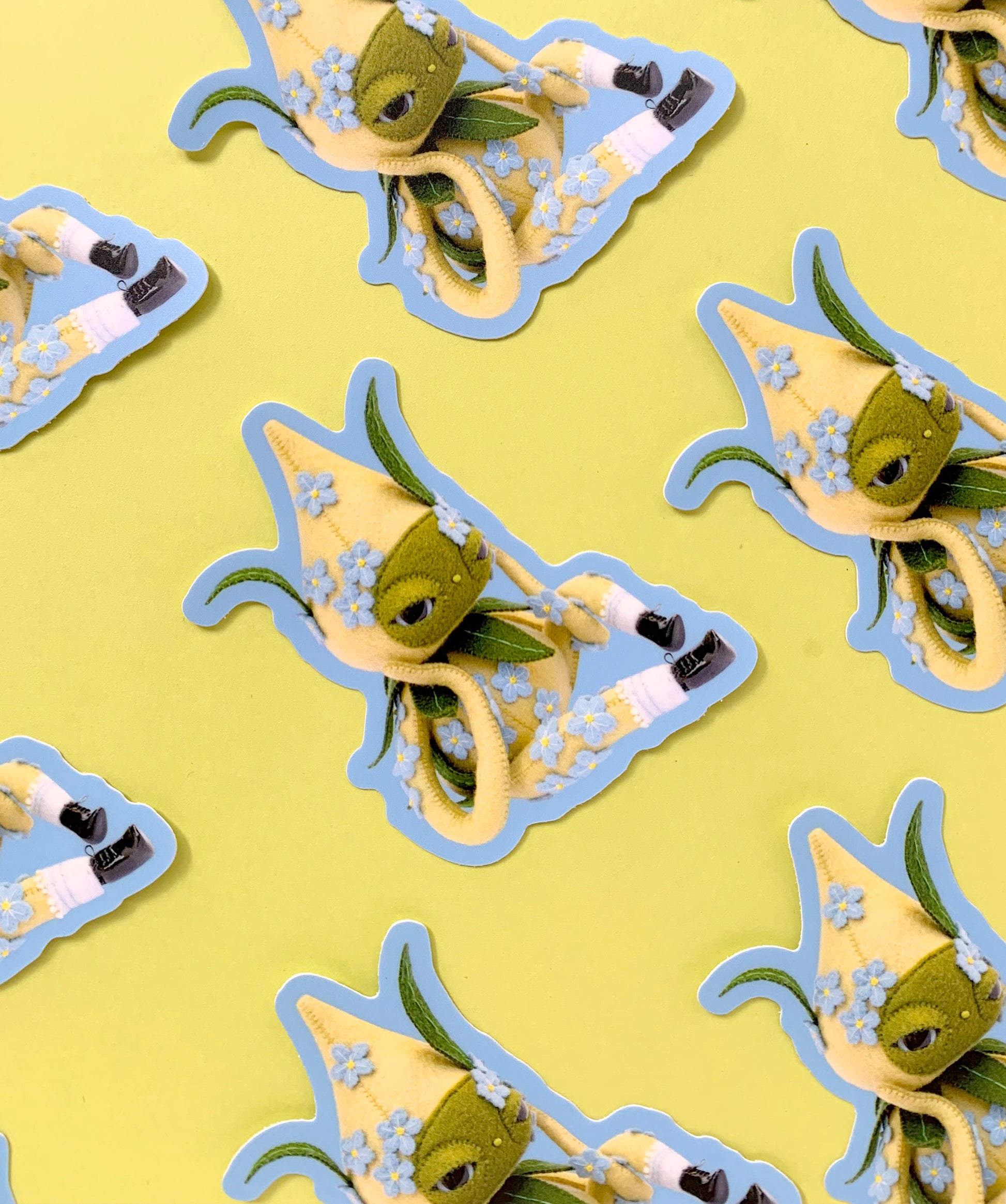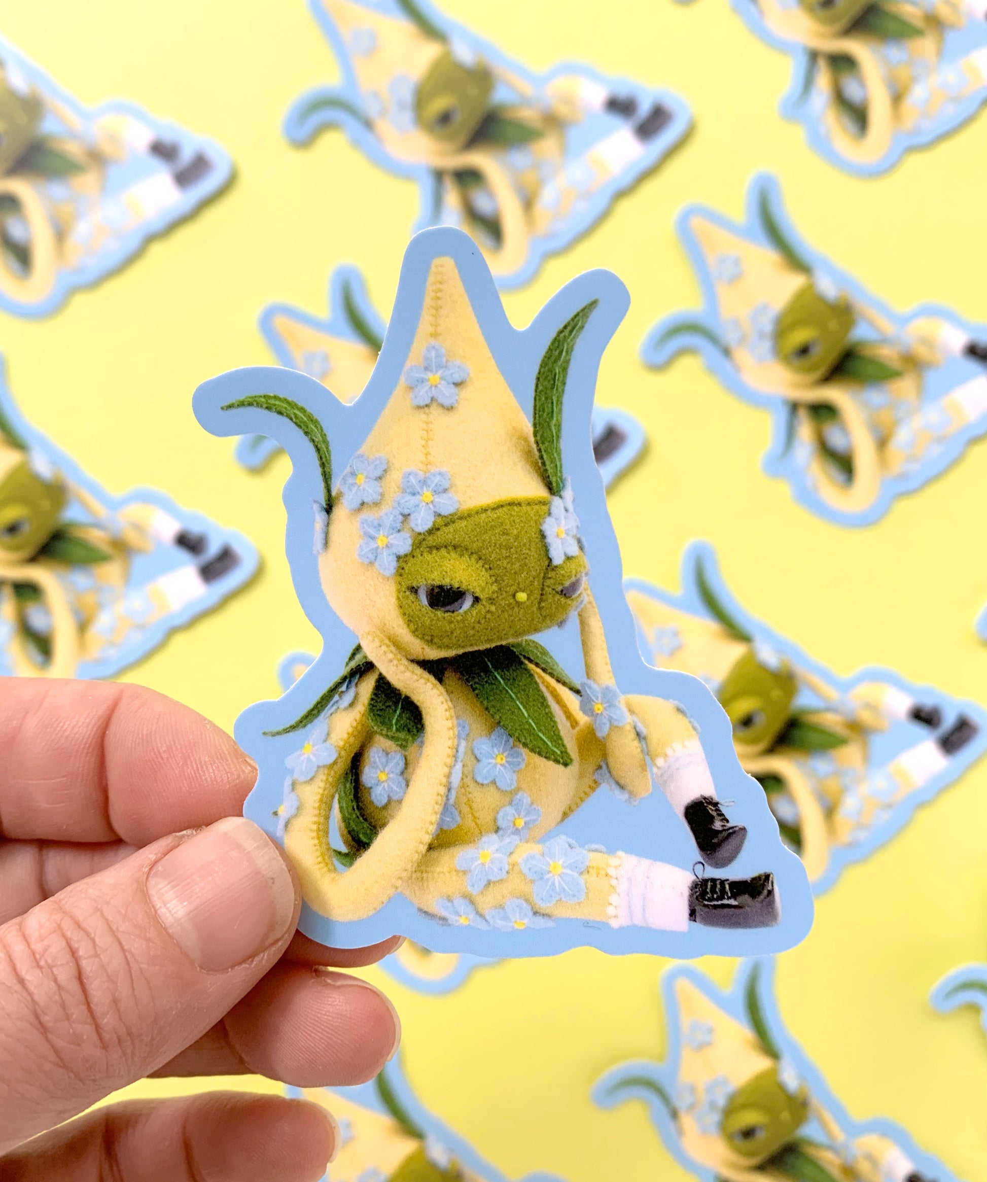 This listing is for x1 sticker featuring a photograph of a forget-me-not flower covered felt hand sewn Hannakin creature with shiny black boots.