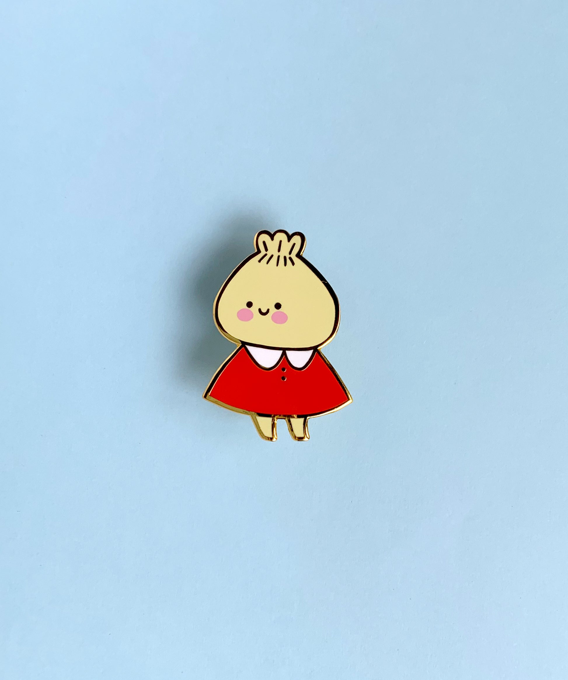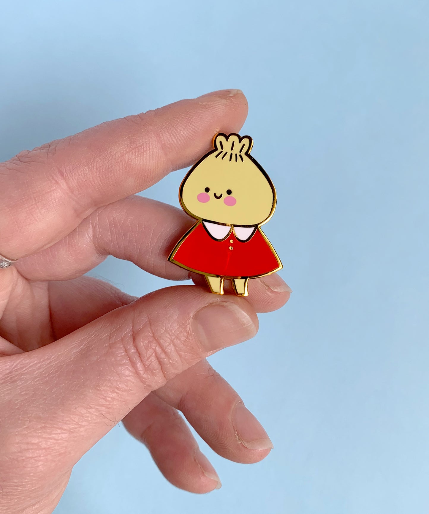 This listing is for x1 cute 2.5cm x 3.5cm red, white and cream hard enamel pin with shiny gold metal finish and pink screen-printed rosy cheeks.