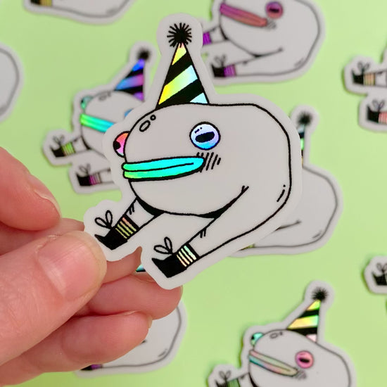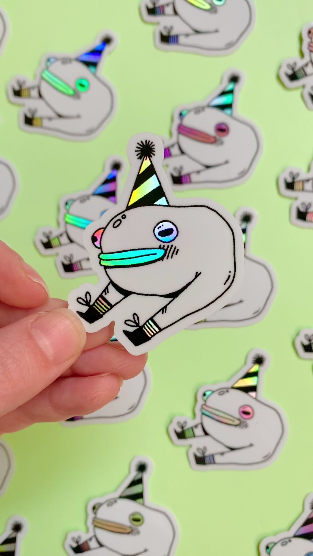 x1 vinyl sticker of a strange amphibious creature wearing striped socks and a fancy hat with holographic accents (hat, socks, eyes, lips) and shiny gloss finish.