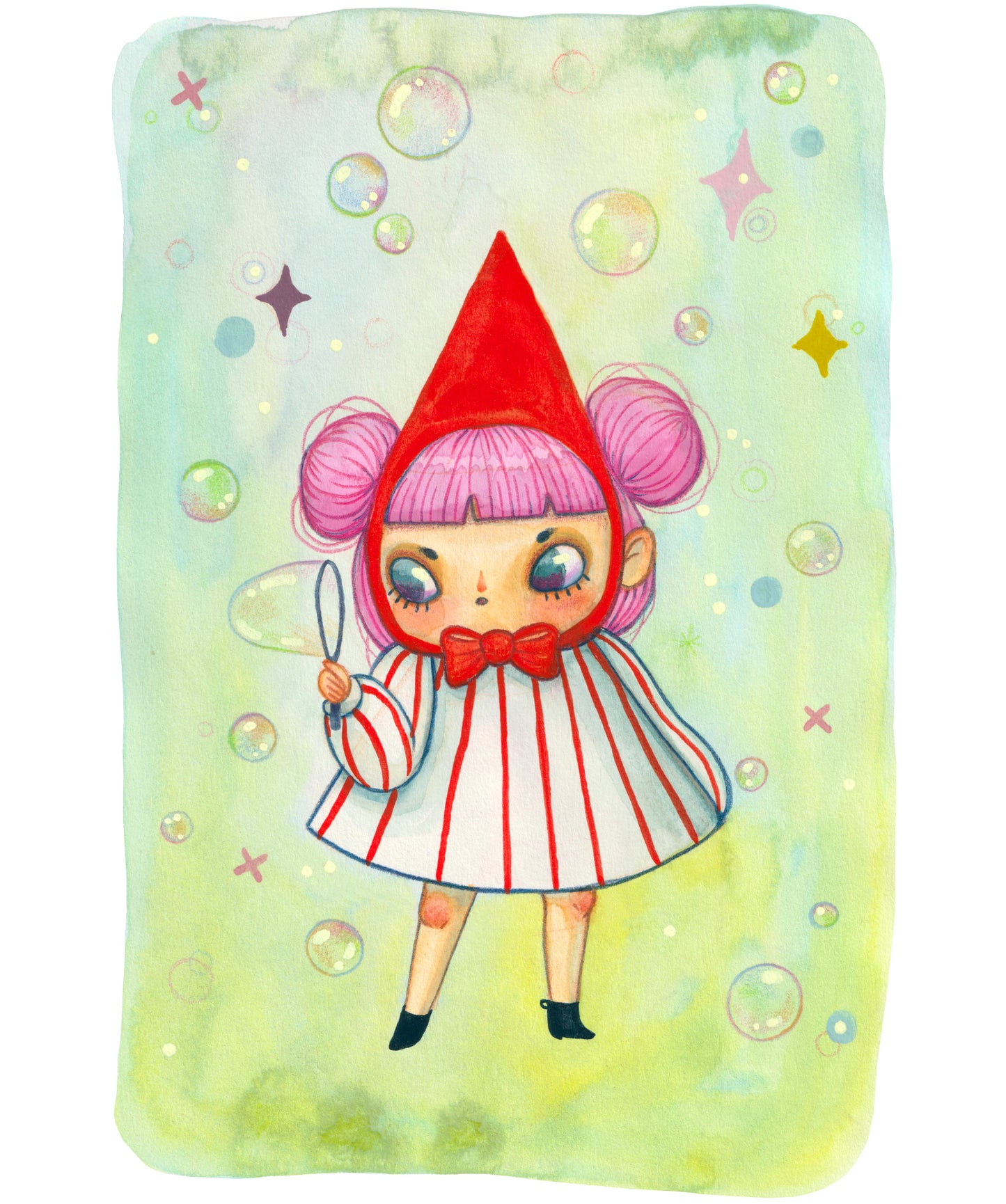 An archival quality mini print of watercolour, gouache and coloured pencil illustration 'Soap Bubblegum'', printed on 320 gsm, acid free 100% cotton rag paper.