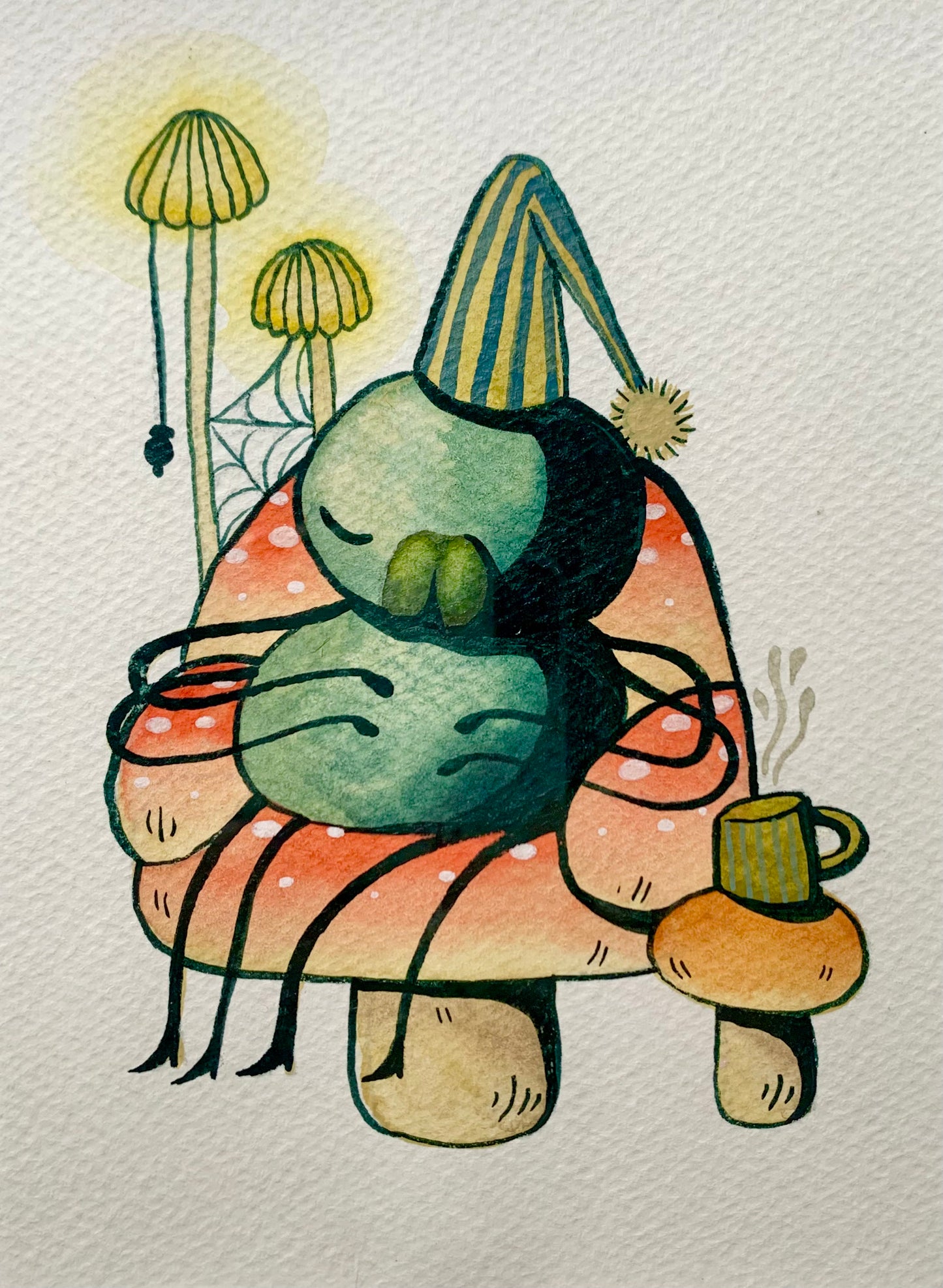 Original gouache illustration "Spider's Night In", 2024, on textured watercolour paper in ornate caramel brown frame.