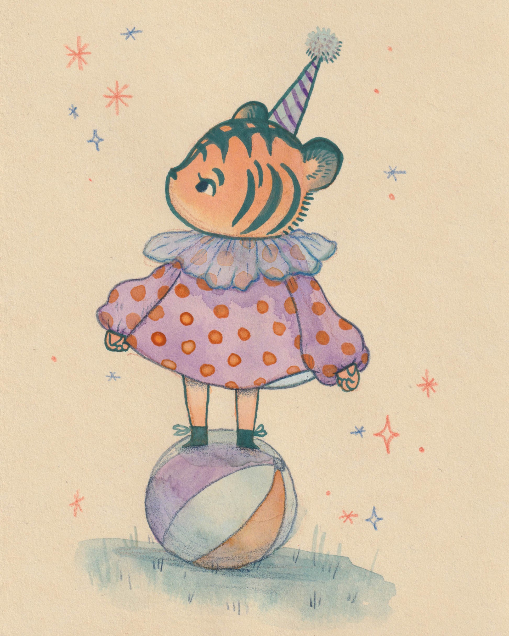Original watercolour and coloured pencil illustration "Spots & Stripes", 2022, on smooth cream coloured printmaking paper with rough torn edges.