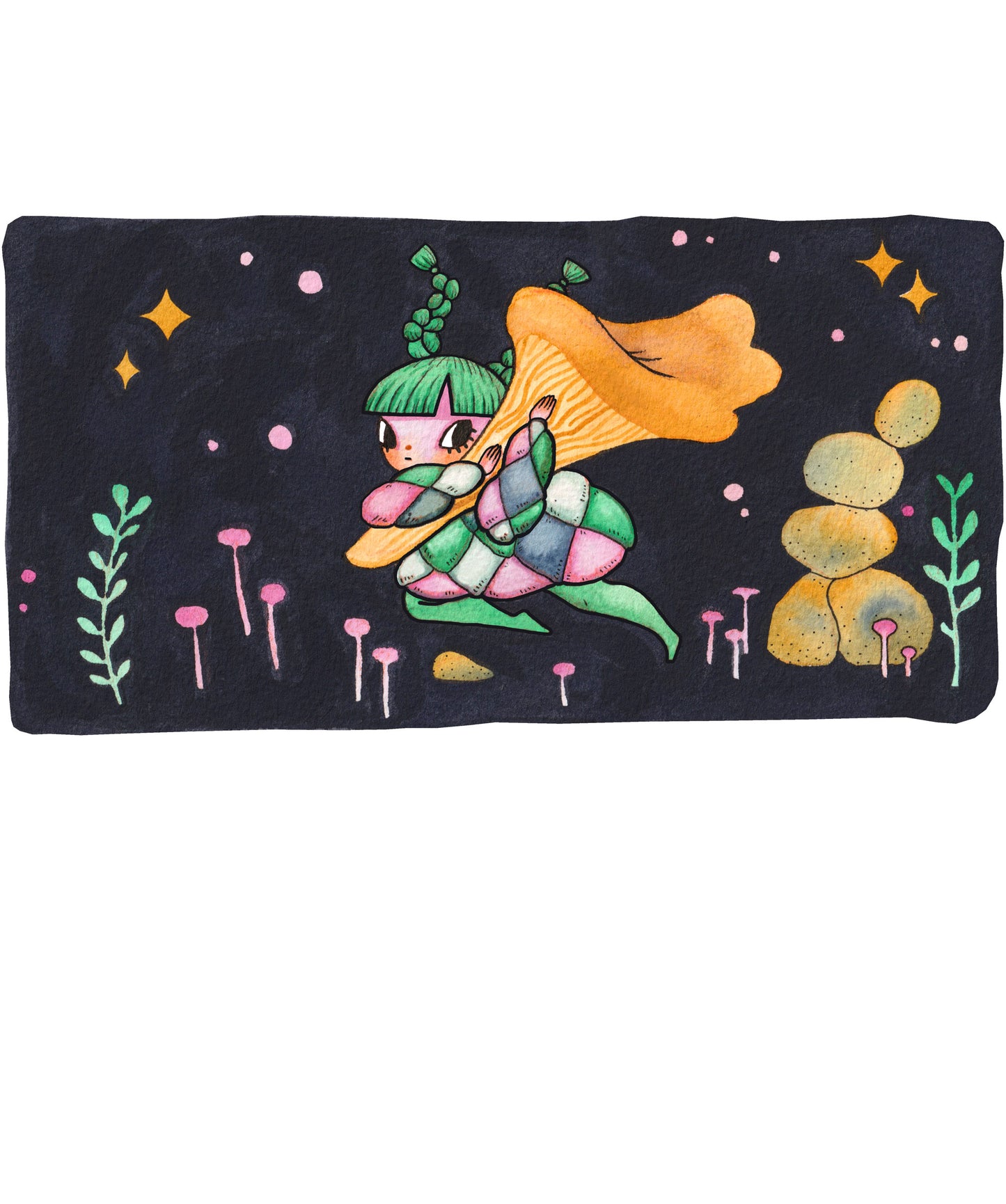 An archival quality print of gouache and ink illustration 'The Chanterelle Thief', on 320 gsm, acid free 100% cotton rag paper.