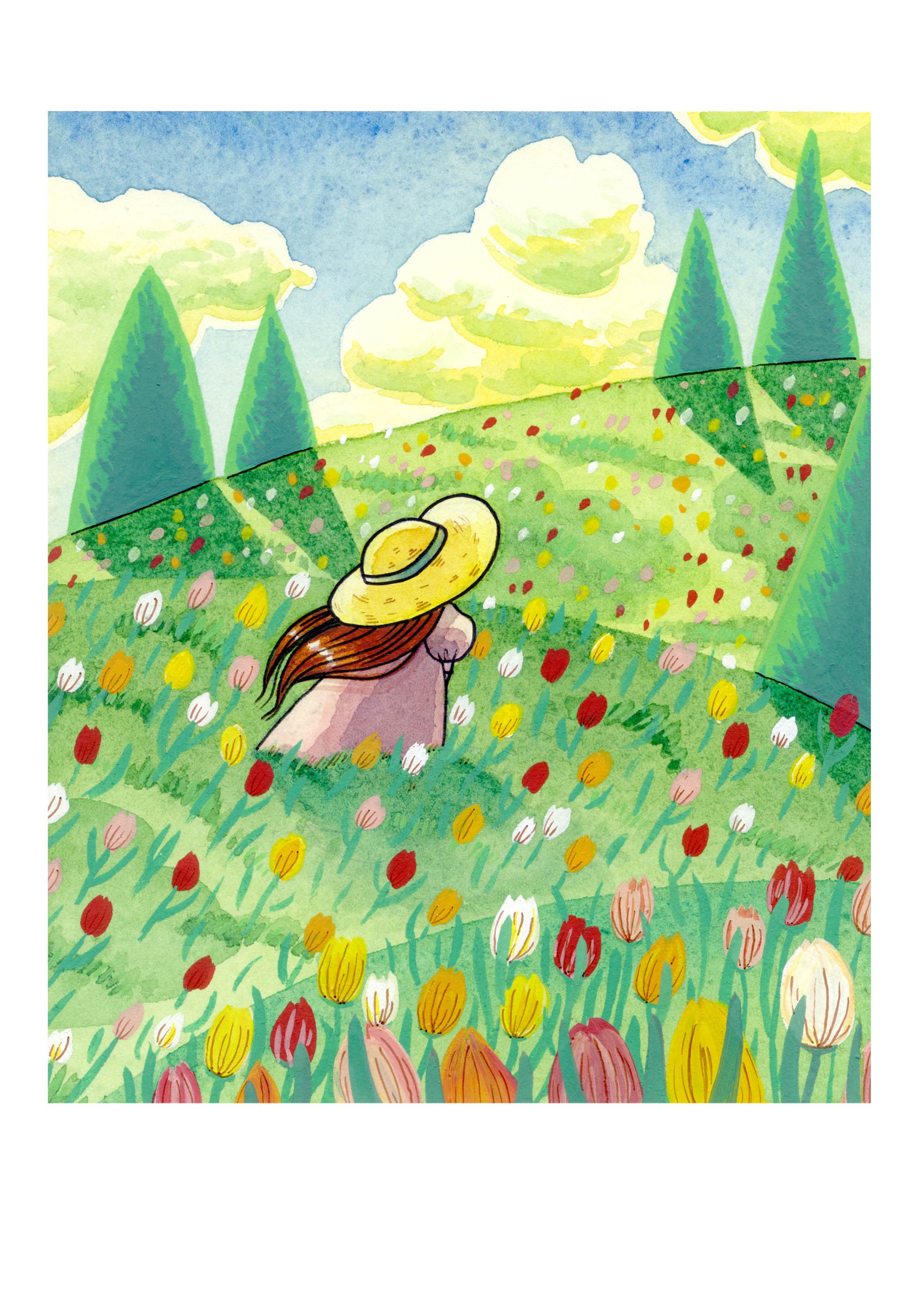 An archival quality print of my watercolour and gouache illustration 'Tulips', on 320 gsm, acid free 100% cotton rag paper.